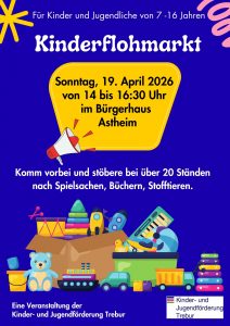 Am 19.04. findet im Bürgerhaus in Astheim ein Flohmarkt für Kinder und Jugendliche statt. An über 20 Ständen verkaufen Kinder und Jugendliche Spielsachen, Bücher oder Stofftiere.